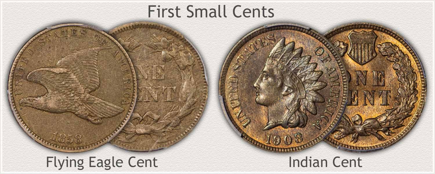 几年后,飞鹰的一分钱被另一个小美分(印度头penny)取代,该美分从1859年到1909年散发. 这枚硬币的特色是一幅肖像,上面戴着印度头饰的自由女神的肖像在其正面的一面,另一侧的花圈. 它还具有一些新功能,例如凸起的轮辋,可以帮助防止循环期间的磨损和围绕其外部边缘写的座右铭,包括“我们信任的上帝”.